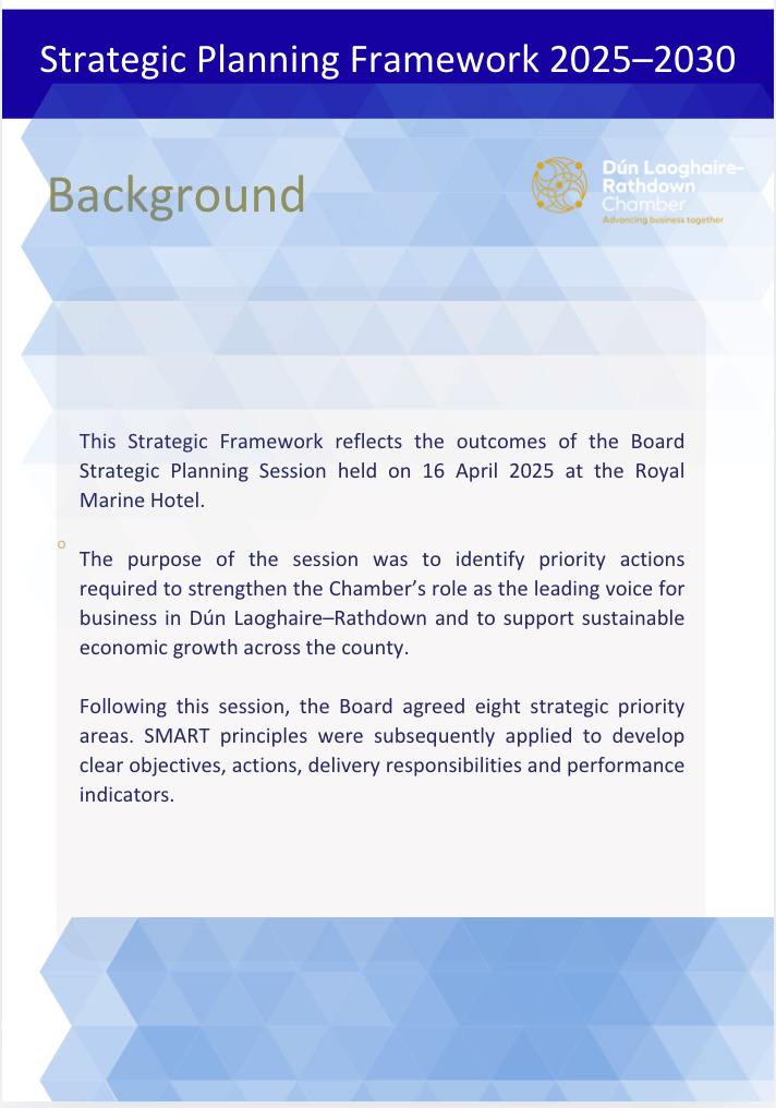 Developed in close collaboration with our members, Board, and Executive team, it reflects both the evolving challenges and the significant opportunities facing businesses in Dún Laoghaire-Rathdown.